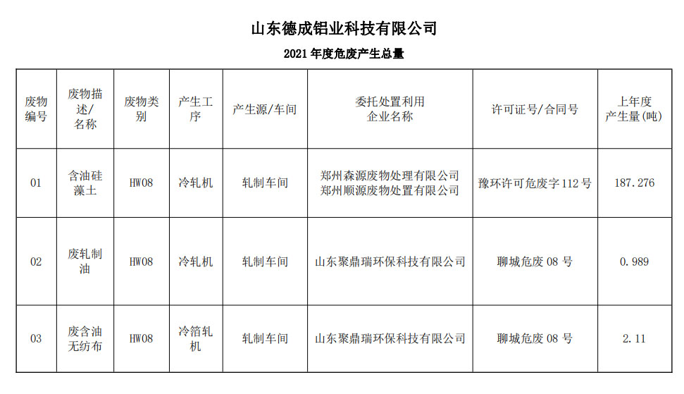 山東德成鋁業科技有限公司2021年度危廢產生總量